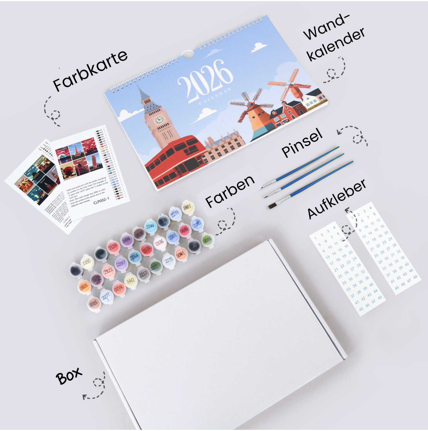 - Ăffne dein Set und entdecke Kalender, Farben, Pinsel & ZubehĂśr.